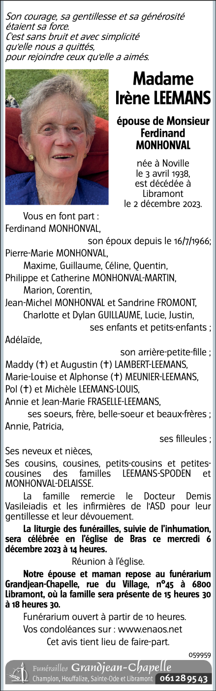 Décédée à Libramont (6800) le samedi 2 décembre 2023 à l'âge de 85 ans