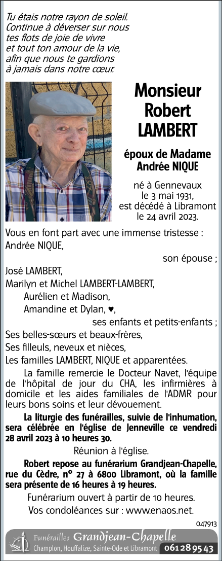 Décédé à Libramont (6800) le lundi 24 avril 2023 à l'âge de 91 ans