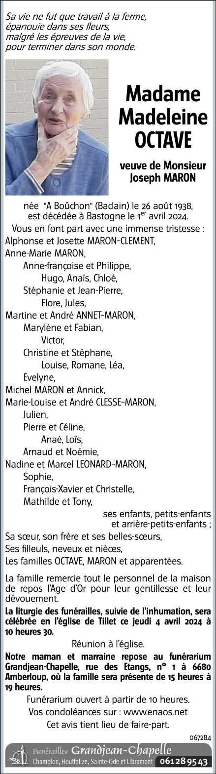 Décédée à Bastogne (6600) le lundi 1 avril 2024 à l'âge de 85 ans