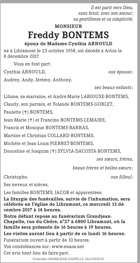 Décédé à Arlon (6700) le vendredi 8 décembre 2017 à l'âge de 59 ans