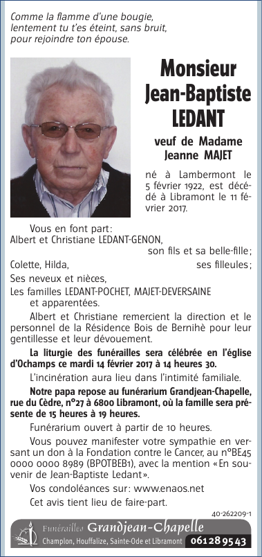 Décédé à Libramont (6800) le samedi 11 février 2017 à l'âge de 95 ans