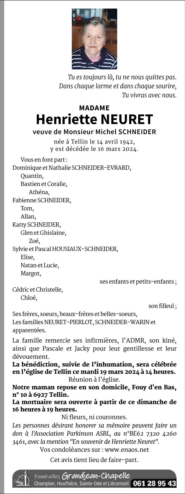 Décédé à Tellin (6927) le samedi 16 mars 2024 à l'âge de 81 ans