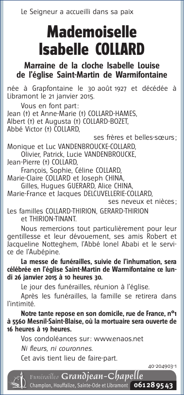 Décédée à Libramont (6800) le mercredi 21 janvier 2015 à l'âge de 87 ans