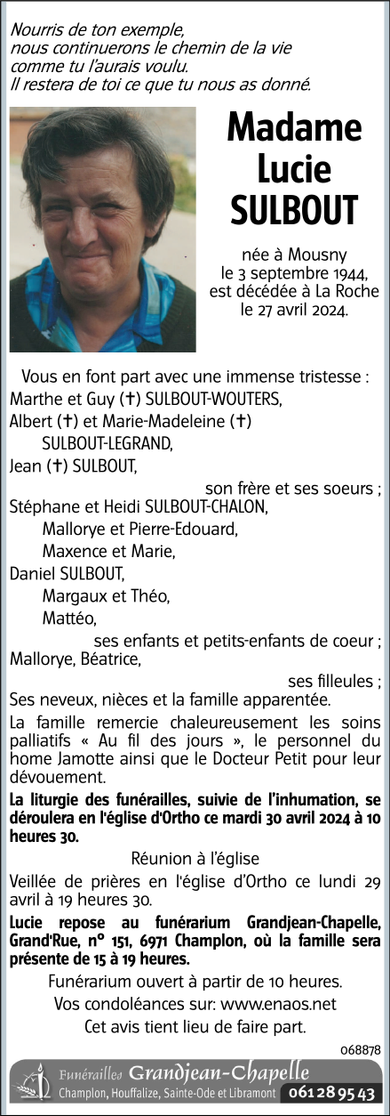 Décédée à La Roche-en-Ardenne (6980) le samedi 27 avril 2024 à l'âge de 79 ans