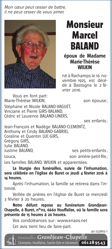 Décédé à Bastogne (6600) le mardi 2 février 2016 à l'âge de 90 ans