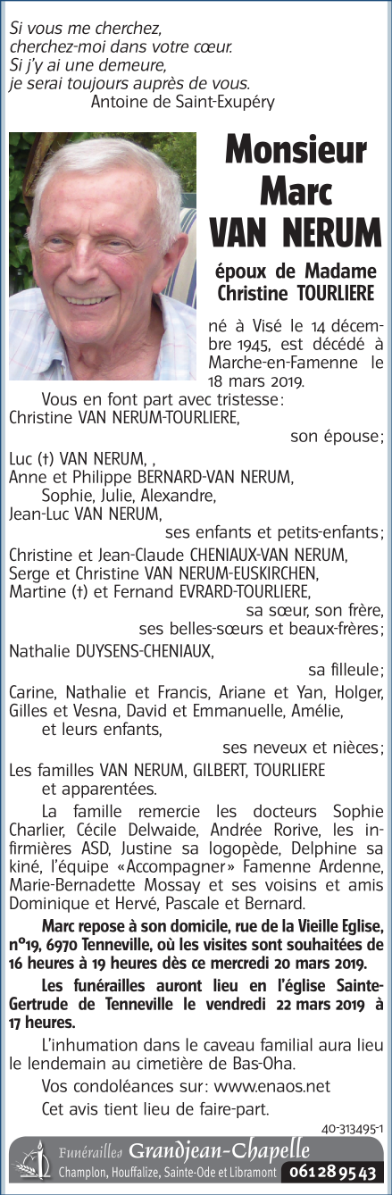 Décédé à Marche-en-Famenne (6900) le lundi 18 mars 2019 à l'âge de 73 ans