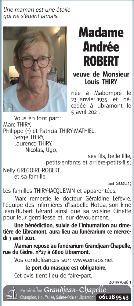 Décédée à Libramont (6800) le lundi 5 avril 2021 à l'âge de 86 ans