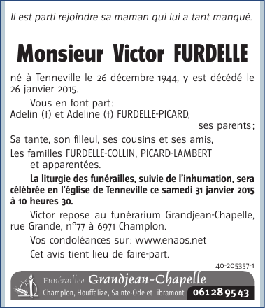 Décédé à Tenneville (6970) le lundi 26 janvier 2015 à l'âge de 70 ans