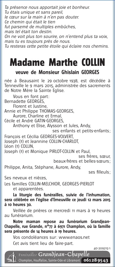 Décédée à Tenneville (6970) le lundi 9 mars 2015 à l'âge de 76 ans