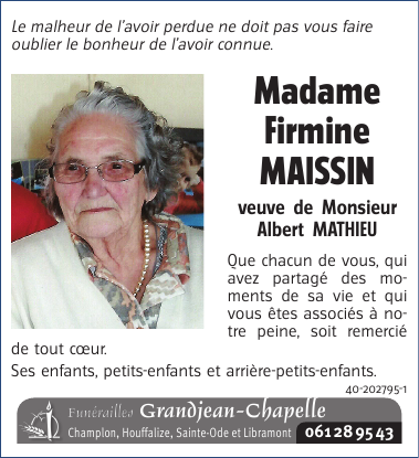 Décédée à Libramont (6800) le mercredi 3 décembre 2014 à l'âge de 85 ans