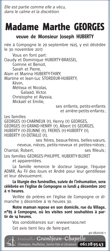 Décédée à Compogne (6687) le jeudi 30 novembre 2017 à l'âge de 92 ans