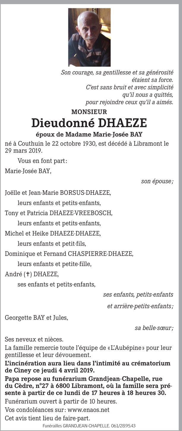 Décédé à Libramont (6800) le dimanche 31 mars 2019 à l'âge de 88 ans