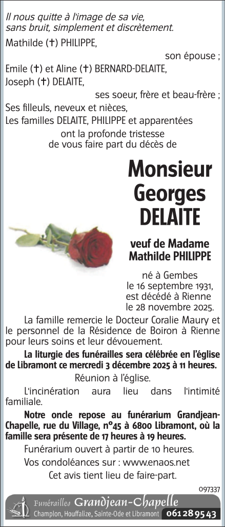 Décédé à Rienne (5575) le vendredi 28 novembre 2025 à l'âge de 94 ans