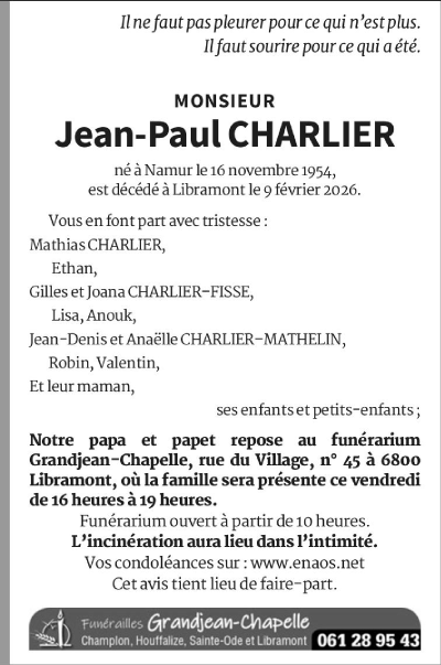 Décédé à Libramont (6800) le lundi 9 février 2026 à l'âge de 71 ans