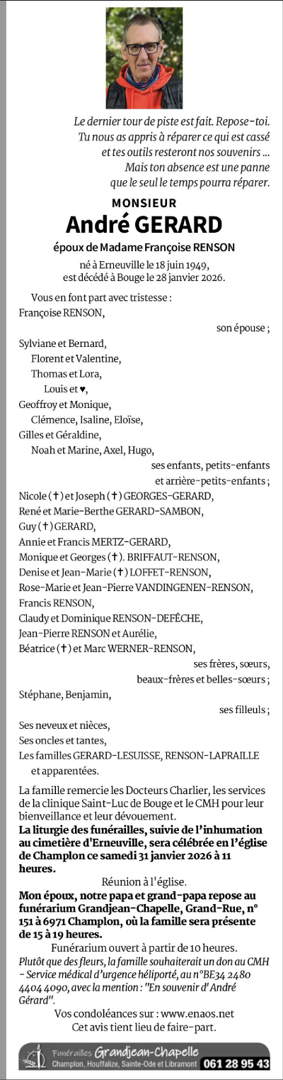 Décédé à Bouge (5004) le mercredi 28 janvier 2026 à l'âge de 76 ans