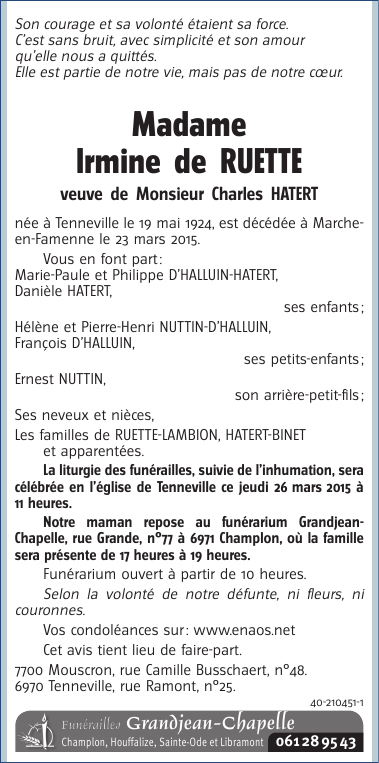 Décédée à Marche-en-Famenne (6900) le lundi 23 mars 2015 à l'âge de 90 ans