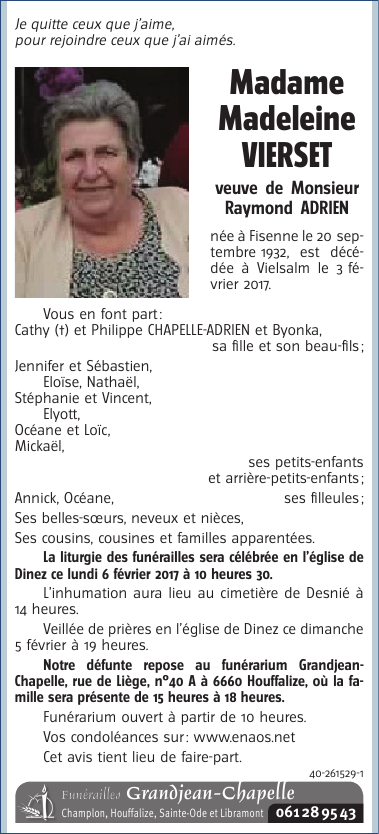 Décédée à Vielsalm (6690) le vendredi 3 février 2017 à l'âge de 84 ans