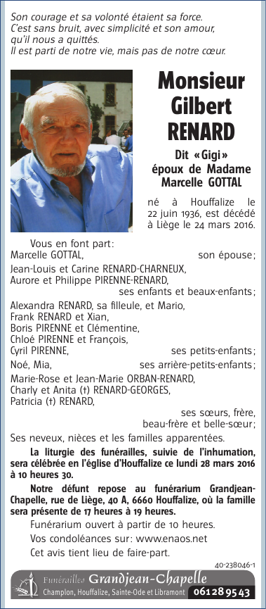 Décédé à Liège (4000) le jeudi 24 mars 2016 à l'âge de 79 ans