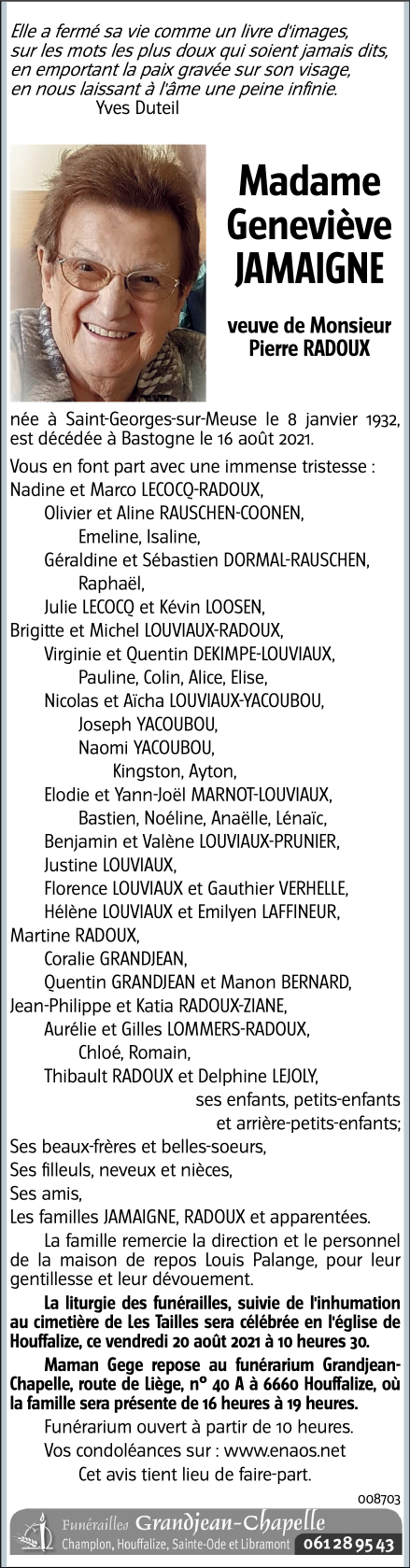 Décédée à Bastogne (6600) le lundi 16 août 2021 à l'âge de 89 ans