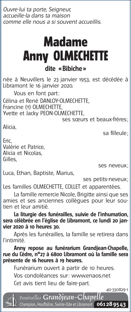 Décédée à Libramont (6800) le jeudi 16 janvier 2020 à l'âge de 66 ans