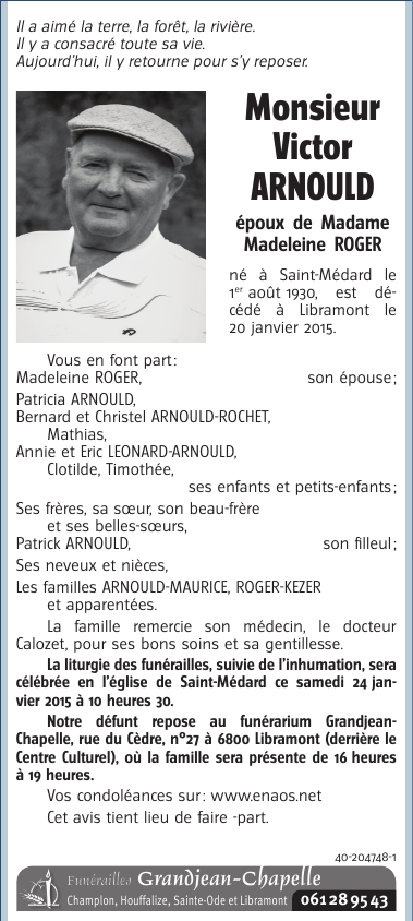 Décédé à Libramont (6800) le mardi 20 janvier 2015 à l'âge de 84 ans