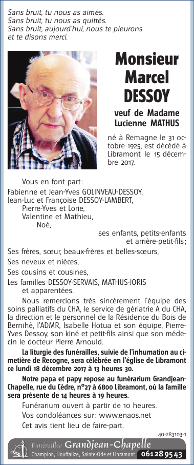 Décédé à Libramont (6800) le vendredi 15 décembre 2017 à l'âge de 92 ans