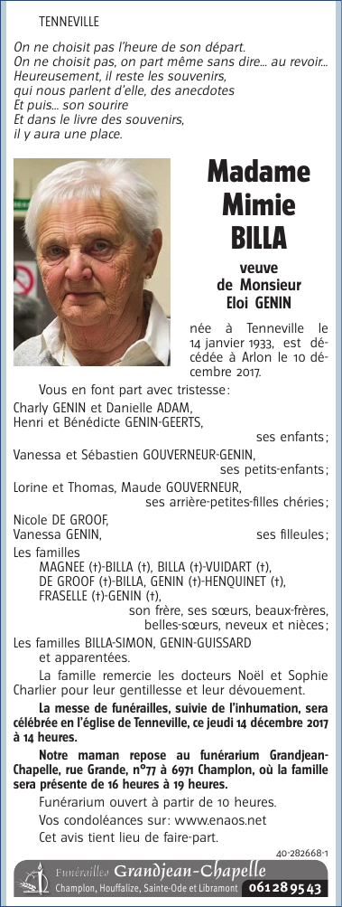 Décédée à Arlon (6700) le dimanche 10 décembre 2017 à l'âge de 84 ans