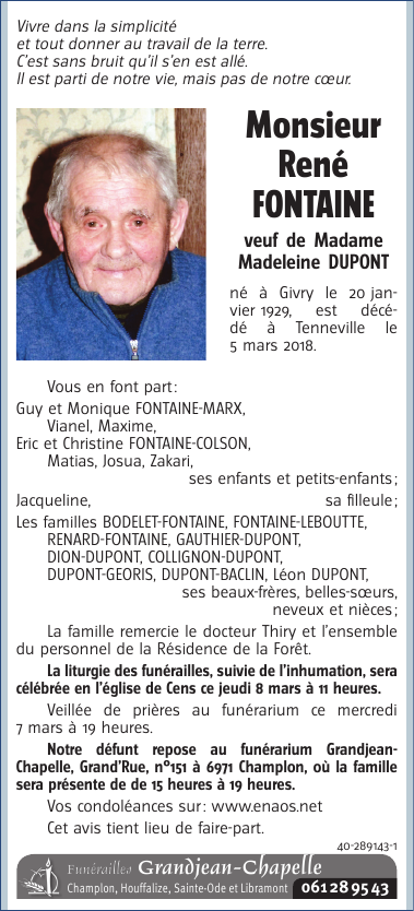 Décédé à Tenneville (6970) le lundi 5 mars 2018 à l'âge de 89 ans