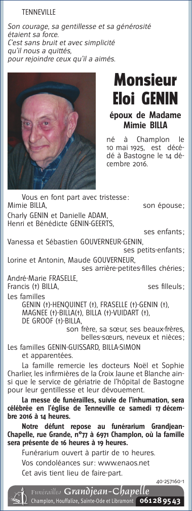 Décédé à Bastogne (6600) le mercredi 14 décembre 2016 à l'âge de 91 ans
