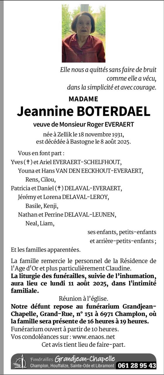 Décédée à Bastogne (6600) le vendredi 8 août 2025 à l'âge de 93 ans
