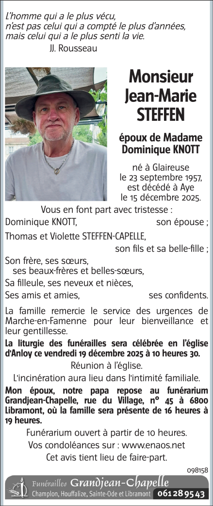 Décédé à Aye (6900) le lundi 15 décembre 2025 à l'âge de 68 ans