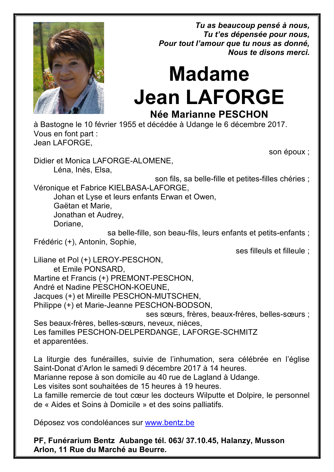 Décédée à Udange (6700) le mercredi 6 décembre 2017 à l'âge de 62 ans