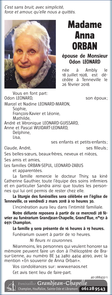 Décédée à Tenneville (6970) le lundi 26 février 2018 à l'âge de 89 ans