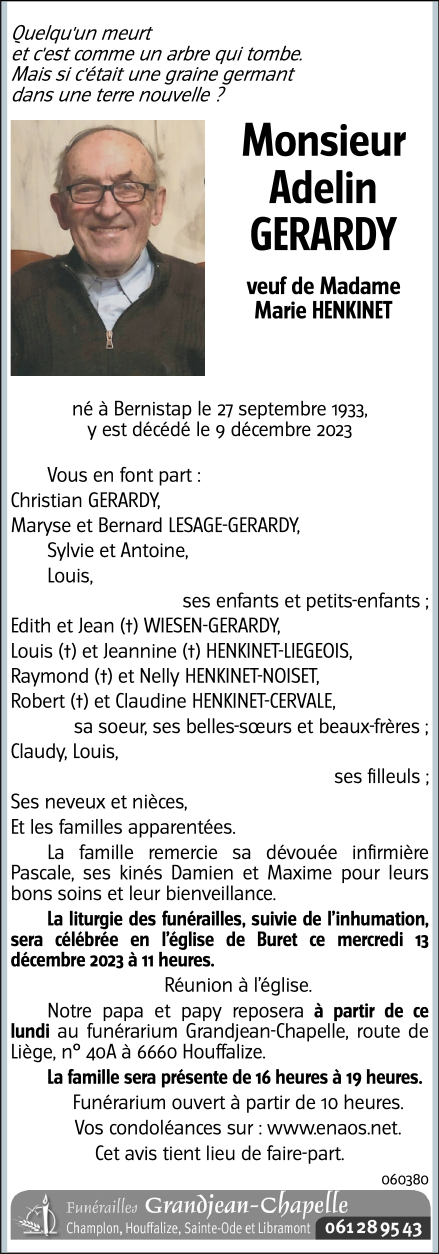 Décédé à Bernistap (6662) le samedi 9 décembre 2023 à l'âge de 90 ans