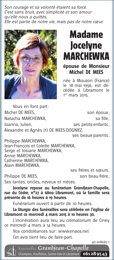 Décédée à Libramont (6800) le dimanche 1 mars 2015 à l'âge de 58 ans