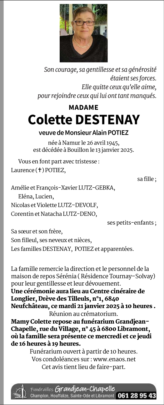 Décédée à Bouillon (6830) le lundi 13 janvier 2025 à l'âge de 79 ans
