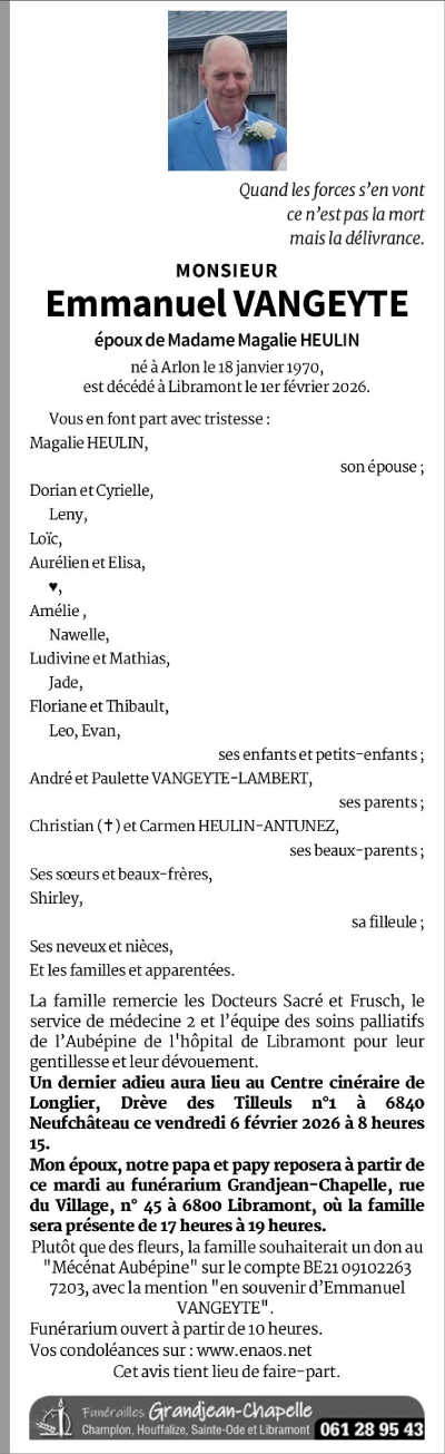 Décédé à Libramont (6800) le dimanche 1 février 2026 à l'âge de 56 ans