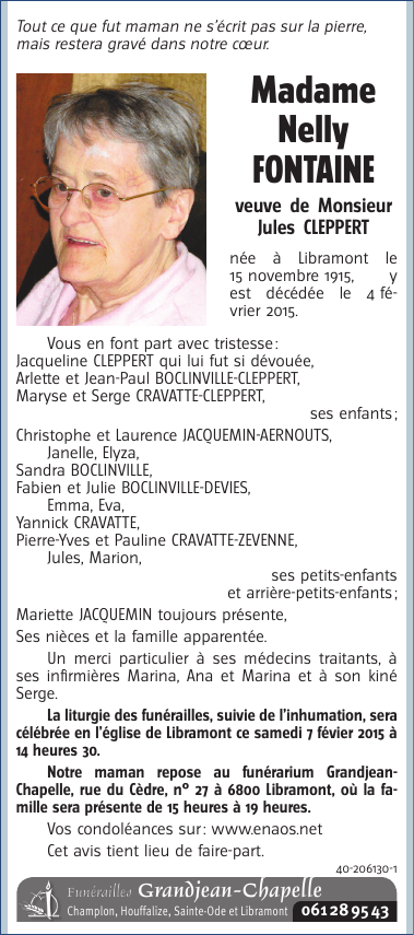 Décédée à Libramont (6800) le mercredi 4 février 2015 à l'âge de 99 ans