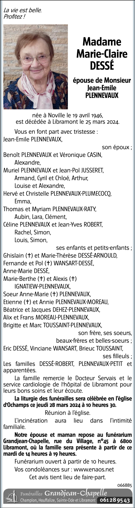 Décédée à Libramont (6800) le lundi 25 mars 2024 à l'âge de 77 ans