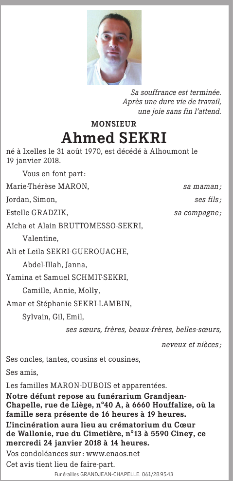 Décédé à Alhoumont (6662) le vendredi 19 janvier 2018 à l'âge de 47 ans