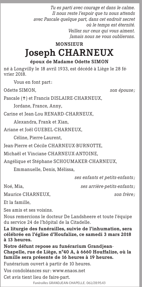 Décédé à Liège (4000) le mercredi 28 février 2018 à l'âge de 84 ans