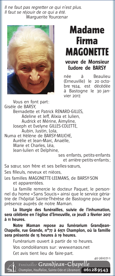 Décédée à Bastogne (6600) le lundi 30 janvier 2017 à l'âge de 92 ans