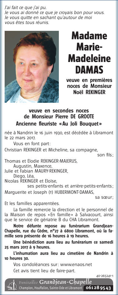 Décédée à Libramont (6800) le mercredi 22 mars 2017 à l'âge de 86 ans