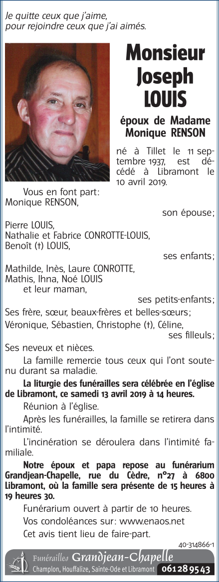 Décédé à Libramont (6800) le mercredi 10 avril 2019 à l'âge de 81 ans