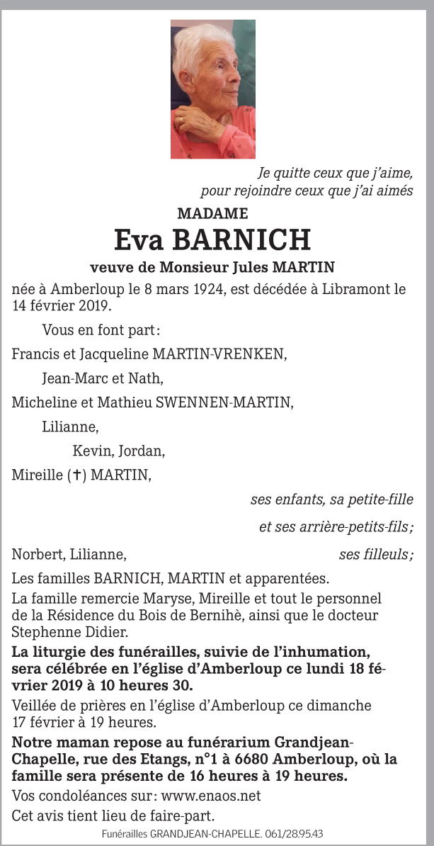Décédée à Libramont (6800) le jeudi 14 février 2019 à l'âge de 94 ans