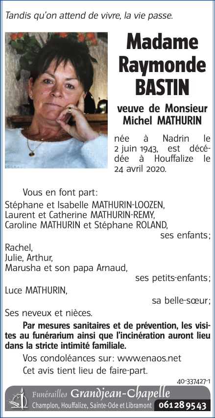 Décédée à Houffalize (6660) le vendredi 24 avril 2020 à l'âge de 76 ans
