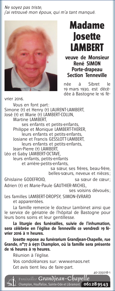 Décédée à Bastogne (6600) le mardi 16 février 2016 à l'âge de 85 ans