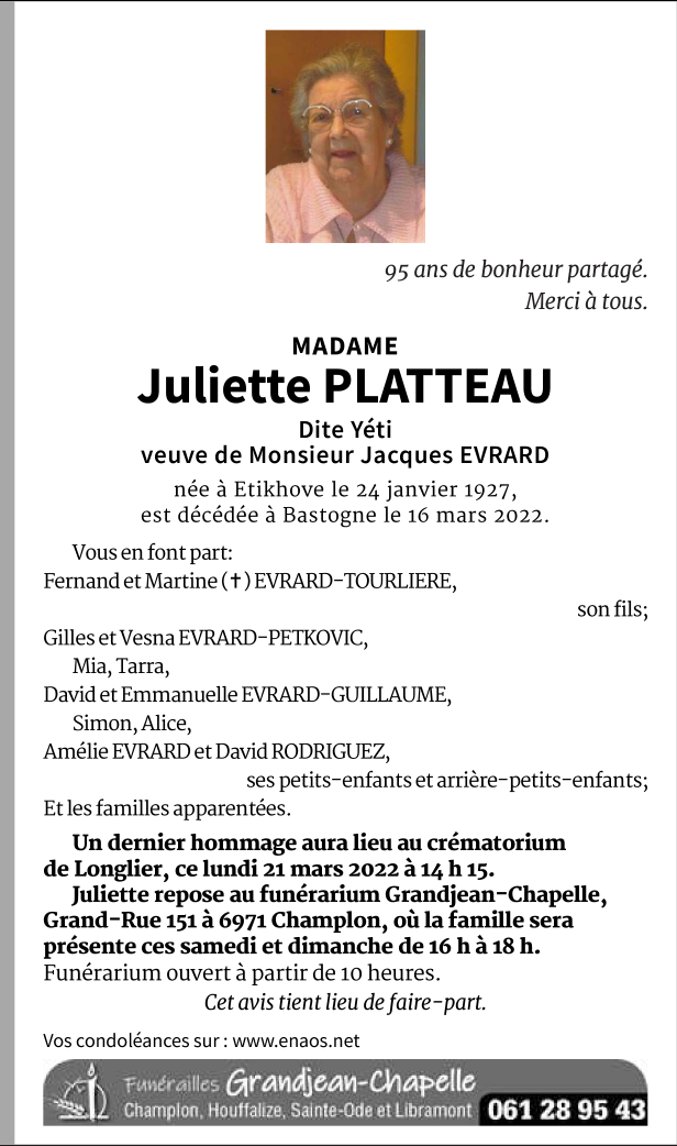 Décédée à Bastogne (6600) le mercredi 16 mars 2022 à l'âge de 95 ans