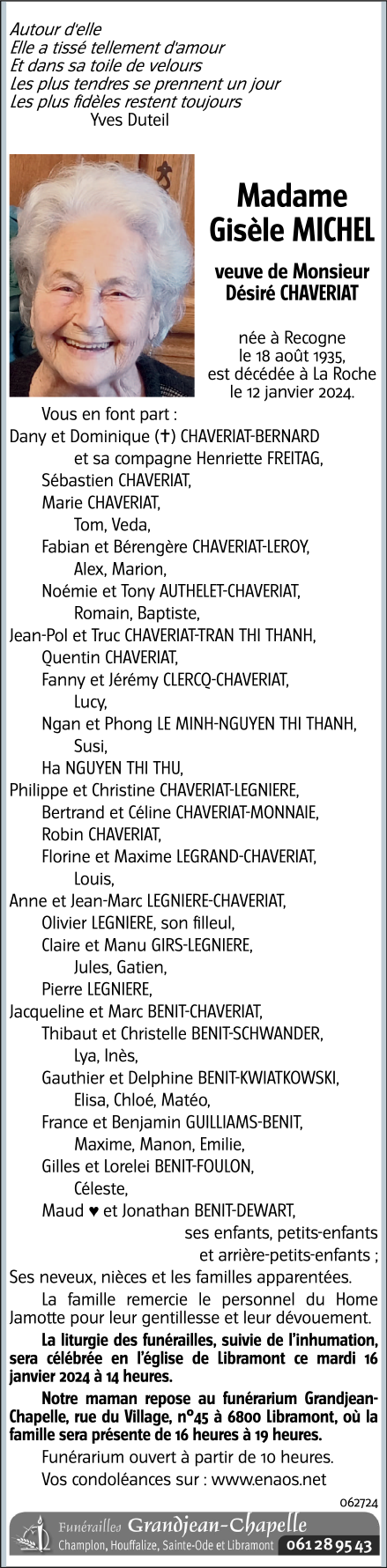 Décédée à La Roche-en-Ardenne (6980) le vendredi 12 janvier 2024 à l'âge de 88 ans