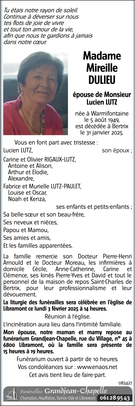 Décédée à Bertrix (6880) le vendredi 31 janvier 2025 à l'âge de 75 ans